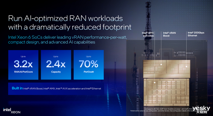 一同发布的至强6系统级芯片面向网络和边缘应用,可提供高性能和能效。在AI驱动的时代,凭借其内置的面向虚拟化无线接入网(vRAN)、媒体、AI和网络安全的加速器,满足对网络和边缘解决方案日益增长的需求。