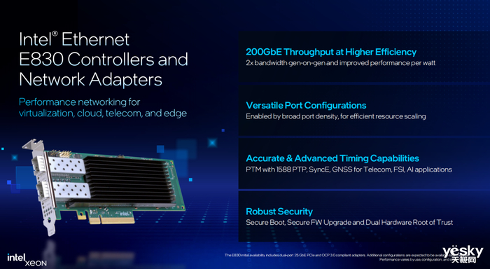 英特尔以太网控制器E830支持在PCIe 5.0总线上提供200GbE的速率,带宽达到上代的两倍;提供1x200GbE、2x100/50/25/10GbE和8x25/10GbE等灵活的端口配置;具备出色的时间同步能力,包括精确时间测量(PTM)、支持1588精确时间协议(PTP)、同步以太网(SyncE)及支持全球导航卫星系统(GNSS)等特性;此外还可以支持增强的安全性能。