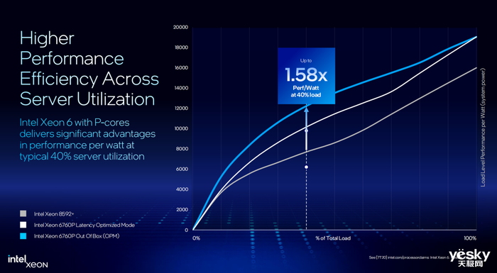 至强6处理器还具备出色的每瓦性能效率,在40%负载情况下,至强6760P对比至强8592+能效提升可以达到58%。以5年使用周期计,平均可以实现以一台新的服务器替代五台旧服务器,在某些用例中该比例可达10:1,从而节省高达68%的总体拥有成本(TCO)。