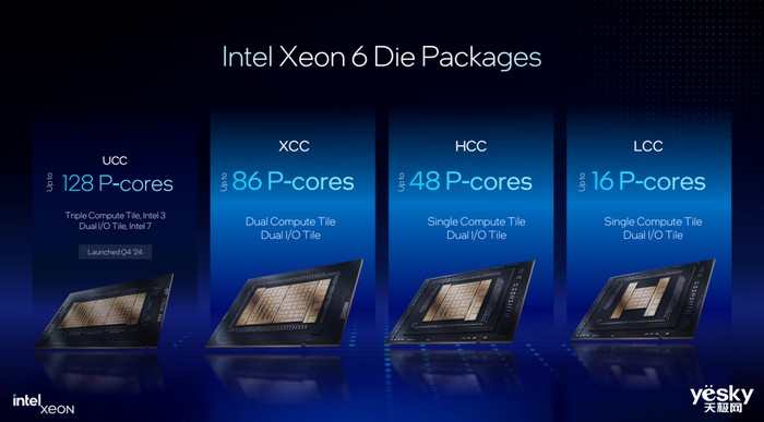 此前英特尔介绍了至强6性能核处理器采用的模块化SoC架构,包括Intel 3工艺的计算芯片单元以及Intel 7工艺的I/O芯片单元,搭配全新封装技术带来更出色的可扩展性和灵活性,例如旗舰至强6980P拥有3个计算芯片单元(UCC)以及2个I/O芯片单元,核心数多达128个。