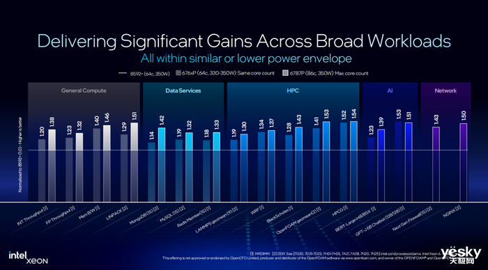 根据英特尔公布的数据,拥有86核心、TDP 350W的至强6787P对比64核心、TDP 350W的至强8592+在通用计算、高性能计算、AI、网络等众多业务中可提升超过50%。