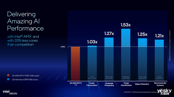 对比竞品,在AI性能方面,双路至强6787P可领先双路AMD EPYC 9755最高达到50%以上。
