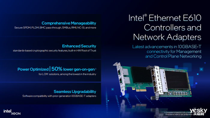 针对控制平面操作优化,英特尔以太网控制器E610和网络适配器提供10GBASE-T连接,并具备出色的能效、可管理性和安全功能,从而简化网络管理,并为网络完整性提供重要保障。据英特尔介绍,E610功耗相比上代降低达到了50%。