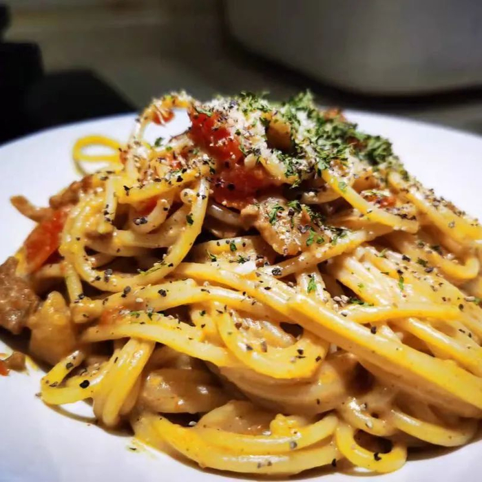 奶油培根口味,特殊香草香气的奶油酱汁中添加了意式培根和双孢菇,每根意面都香甜丝滑。