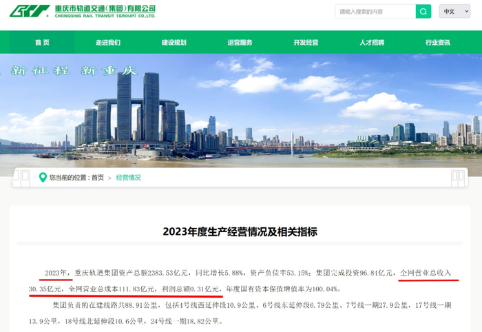 该公司官网公布的数据为:“2023年,重庆轨道集团资产总额2383.53亿元,同比增长5.88%,资产负债率53.15%;集团完成投资96.84亿元,全网营业总收入30.35亿元,全网营业总成本111.83亿元,利润总额0.31亿元。”