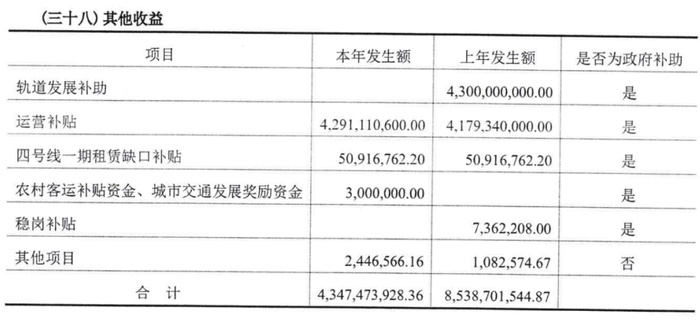 值得注意的是,上述业绩还是2024年重庆轨交集团从重庆市政府获得的政府补贴减少43亿元的前提下取得的——2023年,重庆市政府给予该公司的政府补贴为85.38亿元,2024年降为43.47亿元。该政府补贴在财务报表中,列为“其他收益”科目。