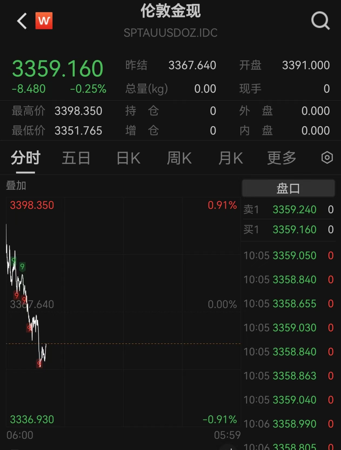 值得注意的是,6月23日,现货黄金高开后持续走低,一度失守3360美元/盎司。
