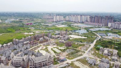 近日,记者来到四川乐高乐园施工现场,通过航拍画面可以看到,乐园内密集矗立着数十栋2至5层高的混凝土楼栋框架,但工地里没有工人在活动,多数尖顶造型建筑旁边的脚手架、塔吊等施工设施已经被拆走,多处平台的半截钢筋暴露在空中。只有靠近乐高乐园规划展示中心和天府大道位置的几栋楼包裹着施工围挡。300多亩的乐园施工现场,只零散地竖立着五六座塔吊。