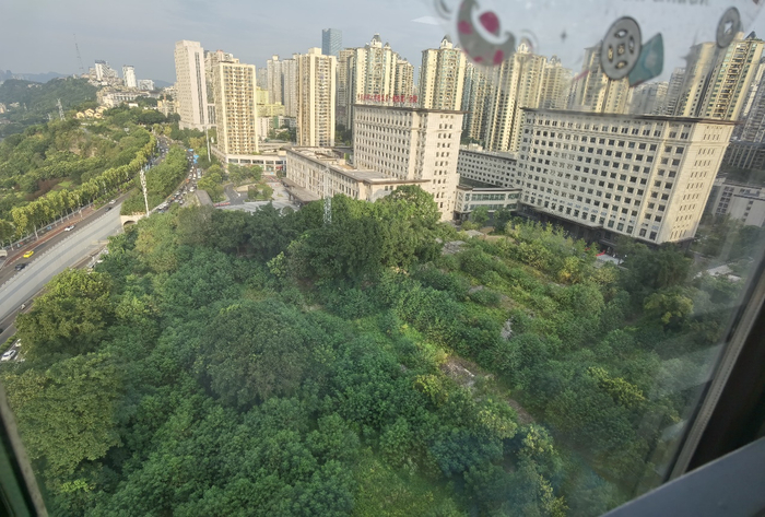 图中覆盖绿植的未开发地块,即为本次重医附一院第一分院二期改扩建工程所在地,该地块为L形,记者拍摄点右侧还有大小与此相当的地块。 本报记者 程维 摄