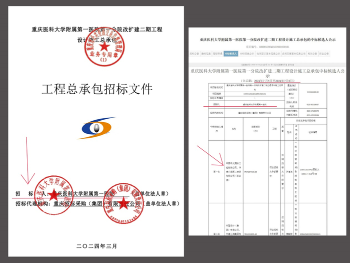 2024年3月公开招标后,二期项目的工程设计施工总承包进行了公开招标,招标人为重医附一院,招标代理机构为重庆招标采购(集团)有限公司。