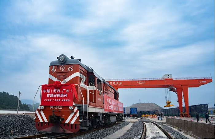 中越(河内—广元)回程班列历时5个昼夜,从越南河内出发,经中国广西凭祥口岸入境,最终抵达广元铁路综合物流基地。列车共装载了20个40英尺集装箱,货物总重540吨,价值200余万元。