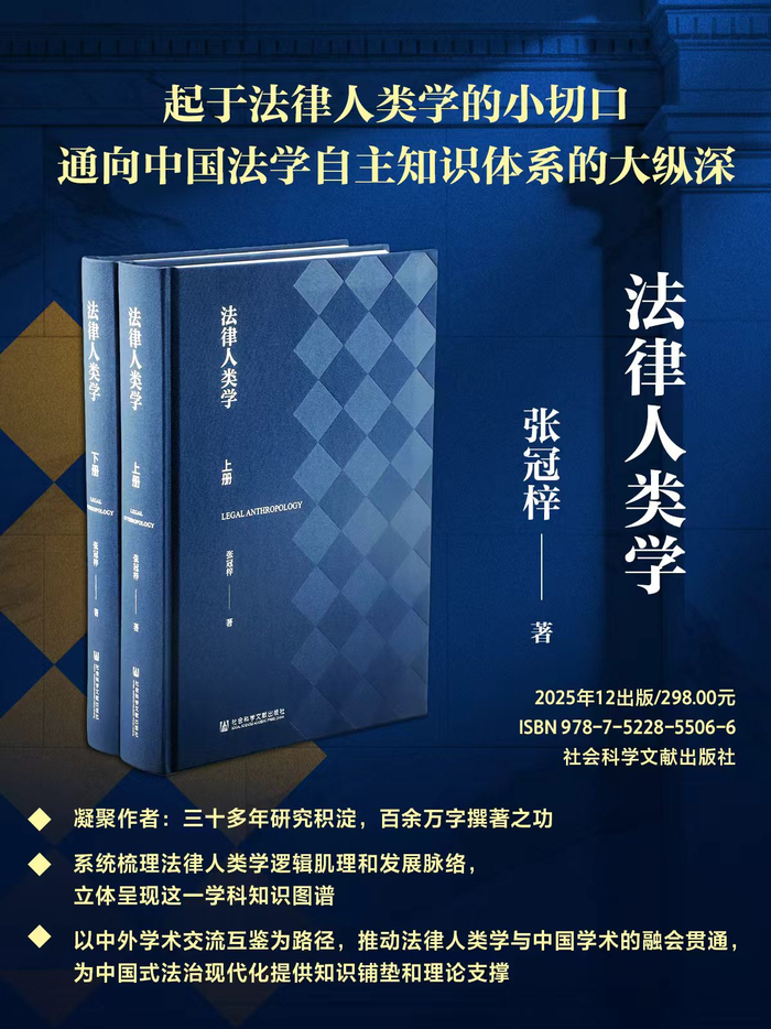 近日,中国社会科学院教授张冠梓历时多年撰写的百万字学术巨著《法律人类学》(上下卷)由社会科学文献出版社正式出版。该著作全面梳理了法律人类学的理论脉络与方法实践,融合中西视角,系统构建了该学科的认知框架与研究体系。