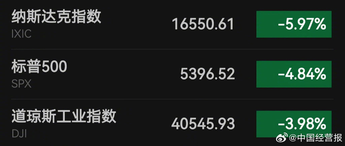 【#特朗普回应美股大跌#】当地时间4月3日,美股三大指数集体暴跌。纳斯达克指数跌幅达5.97%,创下了自2020年3月以来的最大跌幅,标普500指数大跌4.84%,创下了自2020年6月以来最大单日跌幅,道琼斯指数跌3.98%,跌近1700点,创下自2020年6月以来的最大单日跌幅。美股大型科技股普跌,银行股、芯片股和航空股等大跌,热门中概股集体下挫。