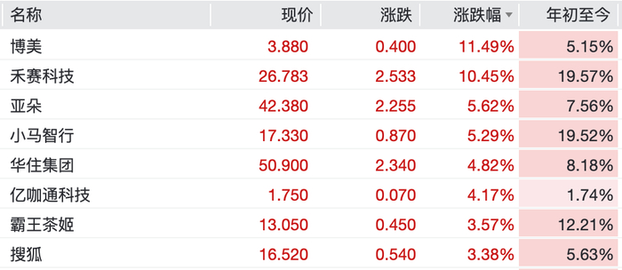 热门中概股涨跌不一,纳斯达克中国金龙指数跌0.78%。博美、禾赛科技涨超10%,小马智行、亚朵涨超5%;阿特斯太阳能、BOSS直聘、老虎证券跌超5%,阿里巴巴跌超3%。