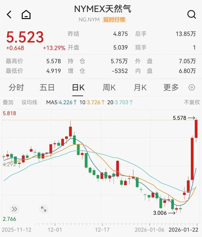 继上个交易日暴涨逾29%后,美国天然气期货继续狂飙,截至发稿,涨幅高达13.29%。