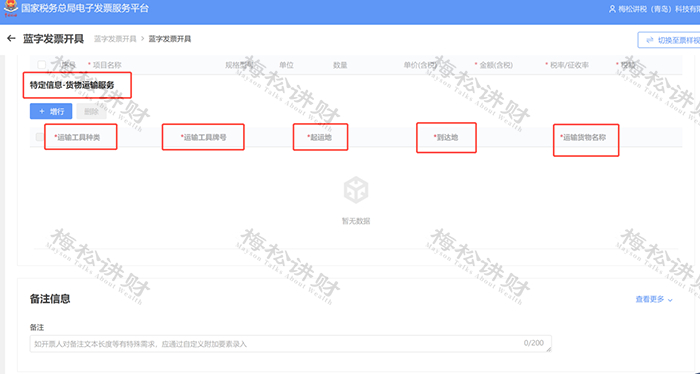 数电发票可直接通过“电子税务局”开具,其中,有5项特定业务,其相应的“备注信息”为必填项(不填开不了票),包括:建筑服务、货物运输服务、不动产销售、不动产经营租赁服务、旅客运输服务。