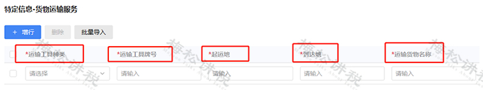 (3)填写【特定信息】:货物运输服务的特定信息,需要填报【运输工具种类】【运输工具牌号】【起运地】【到达地】【运输货物名称】。如下图: