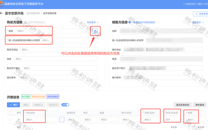 (1)填写【购买方信息】:开具增值税专用发票的,【名称】和【统一社会信用代码/纳税人识别号】为必填项;开具普通发票的,仅【名称】为必填项。