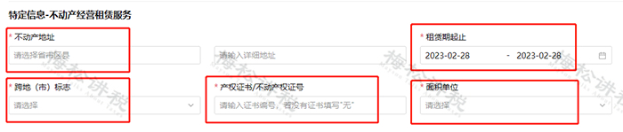 不动产经营租赁服务备注栏必填内容包括【不动产地址】【租赁期起止】【跨地(市)标志】【产权证书/不动产权证号】【面积单位】。