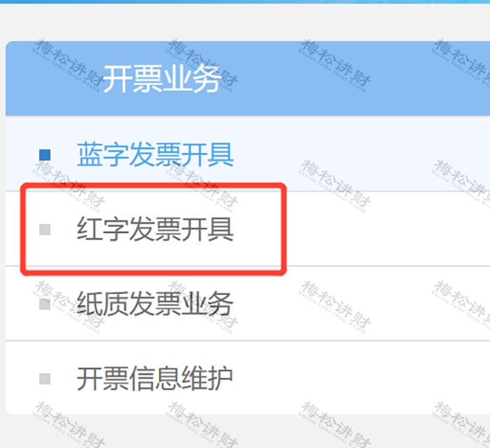 一、登录电子税务局,【我要办税】——【开票业务】——【红字发票开具】。如下图: