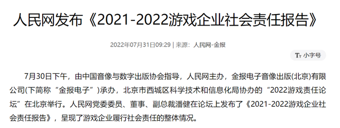 游戏企业的社会责任是指在其商业运作里对其利害关系人应付的责任。企业社会责任的概念是基于商业运作必须符合可持续发展的想法,企业除了考虑自身的财政和经营状况外,也要加入其对社会和自然环境所造成的影响的考量。人民网在此论坛上发布了《2021-2022游戏企业社会责任报告》(下文简称《报告》),呈现了游戏企业履行社会责任的整体情况。