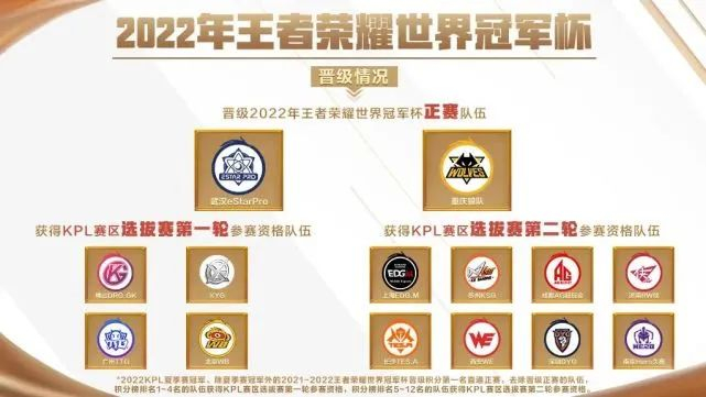 与此前的世冠赛相比,2022王者荣耀世界冠军杯正赛的参赛队伍扩军到16支。KPL赛区的2022年夏季赛冠军、以及世冠晋级积分第一名的队伍将直接获得今年世冠的正赛名额,其他队伍将会通选拔赛争夺余下的6个正赛名额。其他来自境外的12支队伍将通过选拔及邀请的形式产生8个正赛名额。