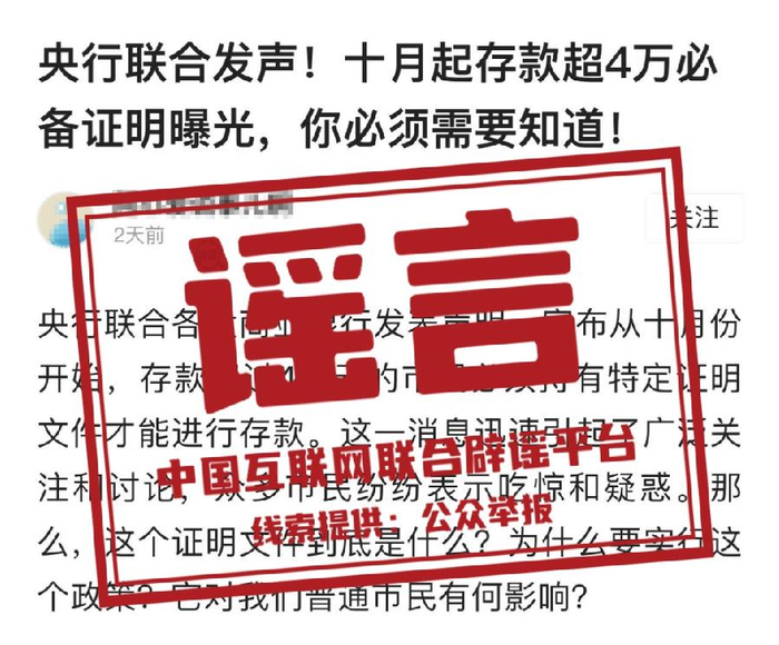 近日,有网络传言“央行将实施大额存款新规,所有大额存款必须出示特定证明材料”“2023年9月起在办理大额存款业务时应出示相关证明材料”等,经向中国人民银行核实,上述传言均为不实信息。中国人民银行从未出台相关规定,请勿信谣传谣。