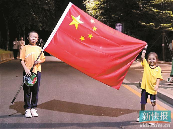@果冻 生在红旗下、长在春风里的兄妹俩,举着五星红旗登白云山,夜幕下的一抹红格外亮眼。一路上,白云山风景区播放着《今天是你的生日》《歌唱祖国》等歌曲。哥哥说,听着这些歌曲让人热血澎湃,扛着国旗昂首挺胸往前走,充满了力量。