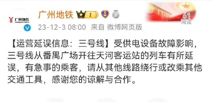 12月3日8时,广州地铁发布消息,受供电设备故障影响,三号线从番禺广场开往天河客运站的列车有所延误,有急事的乘客,请从其他线路绕行或改乘其他交通工具,感谢您的谅解与合作。