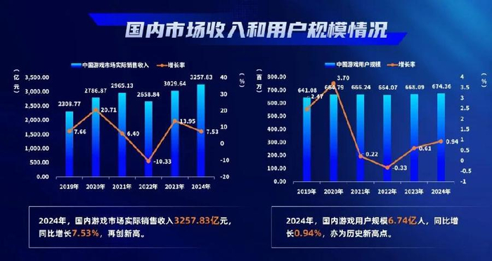 在版号常态化发放并且版号总量增长的态势下,根据游戏工委发布的2024年游戏产业报告显示,国内游戏市场2024年实际销售收入3257.83亿元,同比增长7.53%;中国游戏用户规模6.75亿人,同比增长0.94%,均创下历史新高。