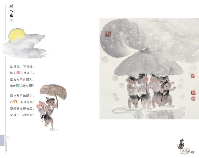也正是梁培龙的“不闲”,他才能一直亲近孩童的心,2024年,80岁的他与“90后”作家郑铸彪共创绘本《花猫花猫你别闹》。跨越五十岁的合作迸发奇妙火花,梁培龙以水墨重现乡村生活场景,郑铸彪用一年级高频字创作童谣。这些童谣文学韵味浓厚,教育意义深远,该书后获央视专题推荐,并输出阿拉伯语版本,成为中华文化走出去的载体。
