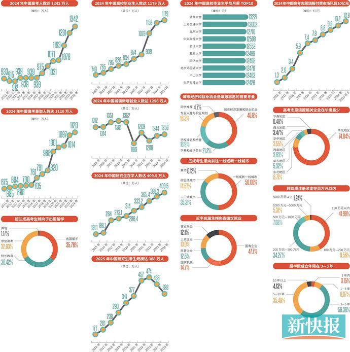 随着中国人口的增加及教育普及率提高,加上越来越多人意识到高等教育的重要性,2024年全国高考报名人数达1342万人,录取率为83.5%,其中本科平均录取率为33.4%。2025年高考报名人数达到1335万人。