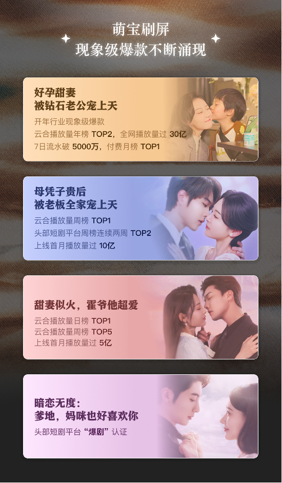 除了《好孕甜妻被钻石老公宠上天》《母凭子贵后被老板全家宠上天》等萌宝系列短剧,阅文短剧在甜宠剧和男频剧方面也有突出表现。例如,改编自阅文大神作家百香蜜的同名原著,由阅文短剧与百香蜜联合操刀的《抱歉我拿的是女主剧本》获得短视频平台春节周榜TOP6以及头部短剧平台周榜TOP 15的好成绩。此外,同样由阅文短剧和大神作家微扬联合推出的短剧《原来你也一直深爱我》冲榜头部短剧平台周榜TOP42名,并获得“爆剧”认证。男频方面,由阅文短剧出品的《嫂子,我真不是傻子了》《都市龙威》《鸿天帝尊》《万古神帝》等一经推出,均位列头部短剧平台周榜前列,获得“爆剧”认证,实现热度口碑双丰收。