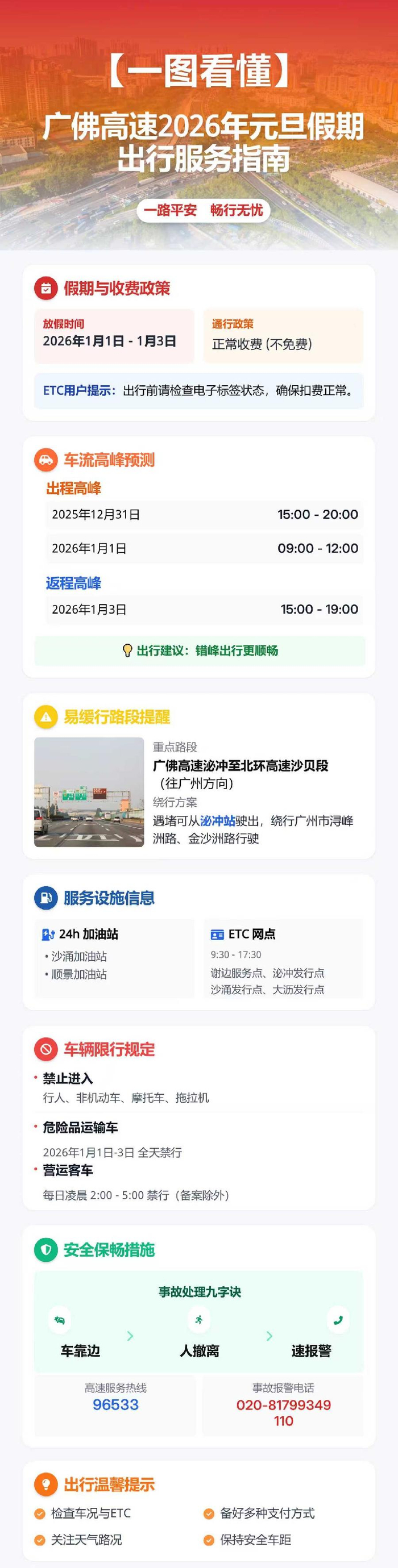 新快报讯 2026年元旦假期将至,为保障群众假期出行安全、顺畅,广佛高速近日发布出行服务指引。假期高速公路将正常收取通行费用,不实行七座及以下小型客车免费通行政策。管理方建议广大驾驶人提前规划、错峰出行。