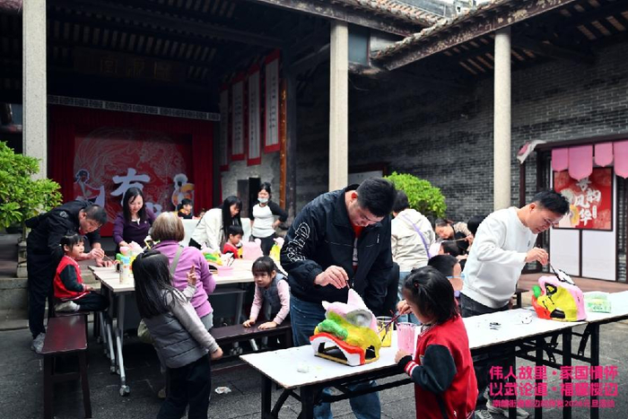 祠堂前的“榄边好市”汇聚15个特色摊位,金声狮鼓的百年狮头工艺品与榄边咸煎饼的香气交织。亲子家庭在贡三陈公祠体验狮头彩绘,孩子们用彩笔勾勒出威风凛凛的狮眼与祥云纹样,在动手间感悟非遗魅力。现场还设置新年打卡墙与烟花泡泡机,游客们挂福牌、拍全景照,将传统年俗与现代创意巧妙融合。