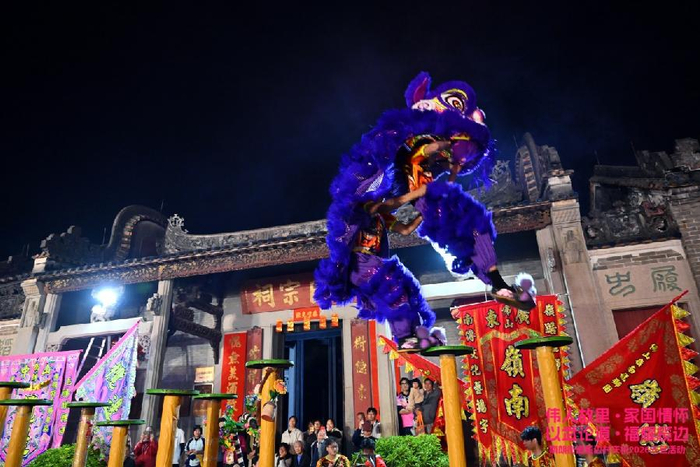 夜幕降临时分,10支大湾区龙狮团带来震撼展演。榄边龙狮团首次亮相即引关注,这群本土青年以腾跃翻滚的矫健身姿,诠释着百年“尚武精神”的当代传承。高桩醒狮在高台上完成“蜻蜓点水”“金鸡独立”等高难度动作时,现场观众掌声雷动。来自佛山的西华里岭南龙狮团更将传统醒狮与高桩技艺结合,狮头在离地2米的桩阵间灵动穿梭,赢得阵阵喝彩。