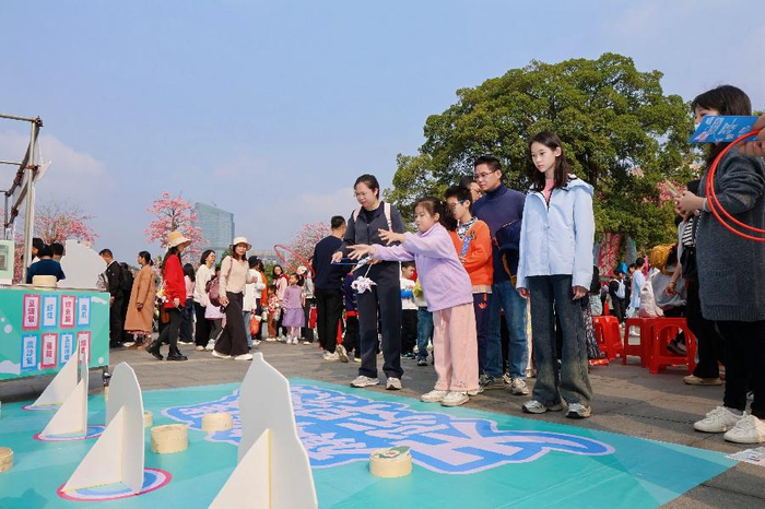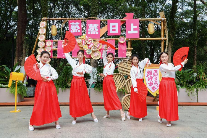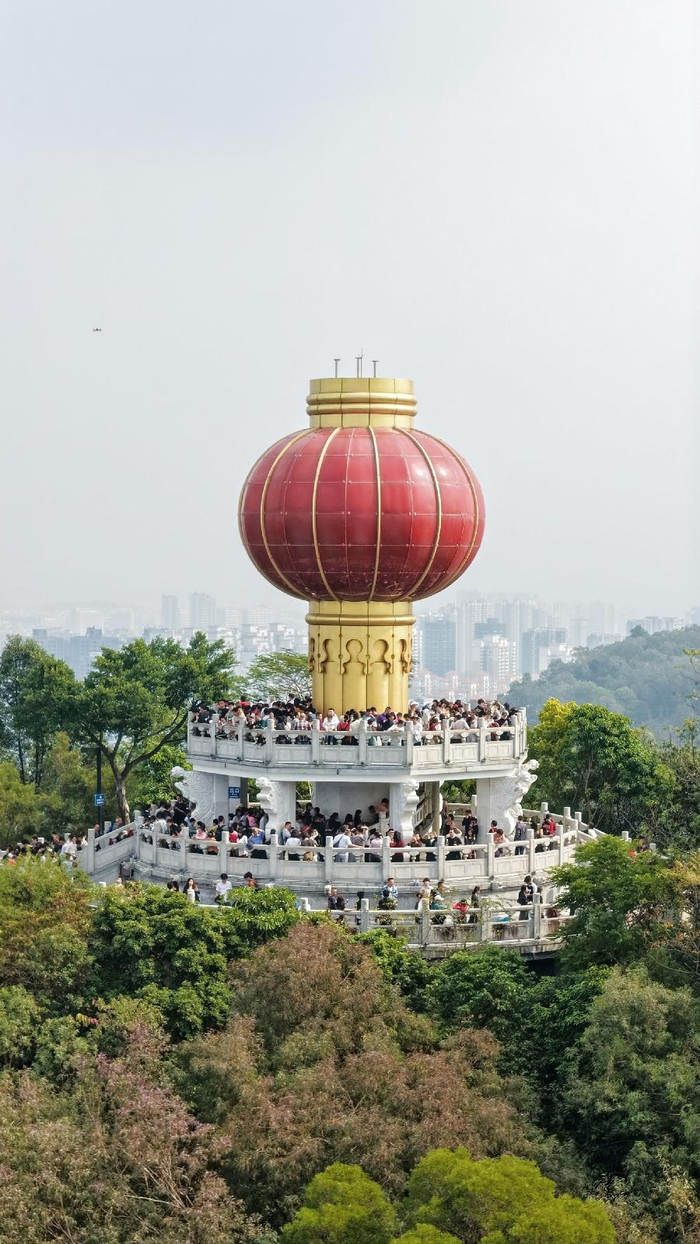 现场趣味互动与特色打卡装置点燃全场氛围,沉浸式体验拉满。山脚的“开笼大吉・旗峰迎曦”活动将早茶元素与套圈游戏相结合,“转运风车・时来运转”区域可DIY风车、书写祝福,参与即可集章;沿山路登高,“蒸蒸日上”“步步糕升”等主题打卡点依次分布,趣味条幅与新中式摆件相映成趣,吸引市民驻足拍摄。半山腰新开的“趣”Tea新地标“芳华里”成为新晋热门打卡地,潮玩、美食、文创一站式汇聚,适配遛娃、约会等多元需求,为登高途中增添了更多游玩乐趣。