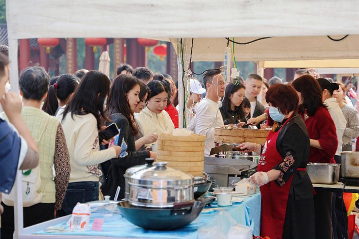 活动现场,山脚与山顶联动发力,热潮涌动。山脚下的“旗峰早茶会”及黄旗山城市公园特色商业街人气鼎盛,多家东莞本地早茶名店、非遗手作工坊及新潮餐饮品牌携招牌好物入驻。各类广式点心香气四溢,身着“店小二”服饰的服务人员以传统吆喝迎客,广式茶席搭配舒缓国风音乐,全方位还原老广早茶的烟火气。