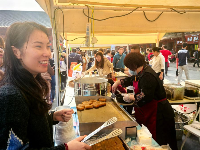 “食返味”摊位前挤满了前来选购的市民,蒸笼冒着热气,煎板上的点心滋滋作响,大家拿着夹子边挑选边交流,满满的烟火气。趁放假过来帮忙的叶李诗告诉记者:“我今天早早就起床赶到旗峰公园的早茶市集,为忙碌的爸妈搭把手。没想到生意这么好!看着市集里一盅两件的趣味布置,还有市民们举家出游、悠闲叹早茶的模样,真切感受到东莞市民生活的丰富多彩。”