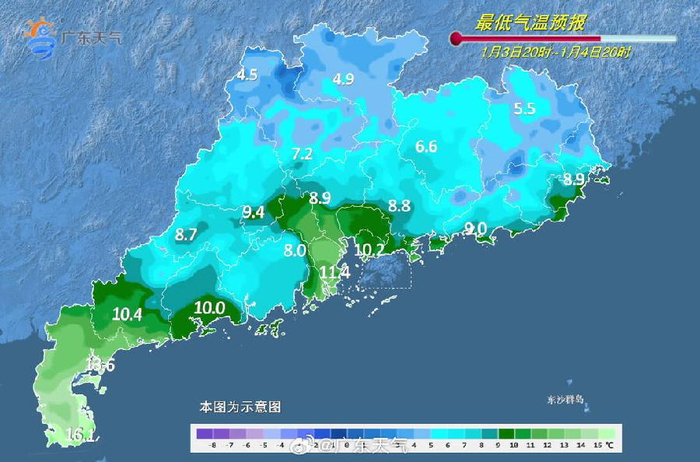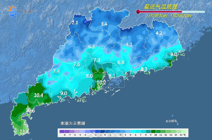 预计,2-3日,继续受较强冷空气影响,广东以多云到晴为主,仍有降温大风天气,过程最低气温将出现在3日或4日早晨,此外,2日陆地有5~7级阵风,2-3日广东海面有6~8级偏北风,阵风8~9级。