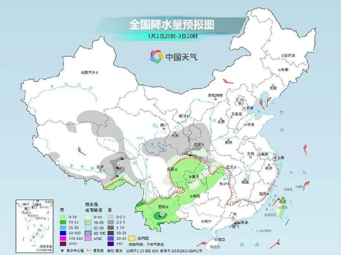 雨雪主要集中在西南地区。受到高原波动影响,未来几天,青藏高原中东部、西南地区东部、西北地区东南部等地仍多小雨雪或雨夹雪,局地有中雪或大雪。其中1月3日前后,西北地区东南部、河南西部、湖北西部等地有小到中雪(雨)或雨夹雪。