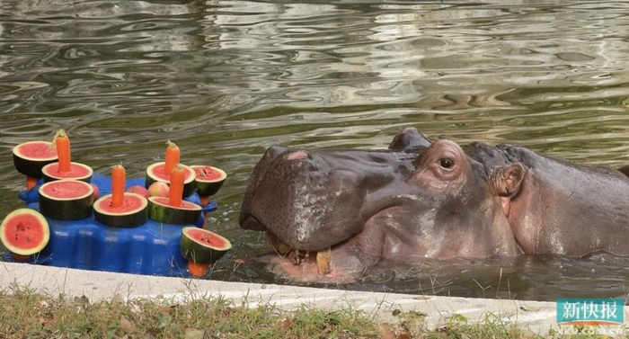河马享受水果“蛋糕”
