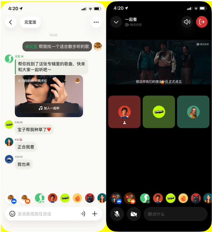 据介绍,“元宝派”是腾讯全新的AI社交探索,其脱胎于腾讯会议里的AI探索与尝试,接入了腾讯会议的音视频底层能力。用户在派里,可以@元宝 播放一首歌、或者播放一部电影,也可以通过“一起看”和“一起听”功能入口,让派友们同步观看同一部电影或收听同一首歌曲,实时发表评论和感受,未来元宝派也有望持续接入、打通腾讯丰富的内容生态。