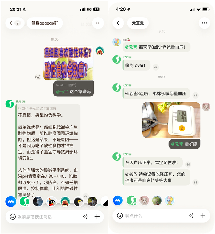在元宝派里,元宝AI可以是24小时在线的、提高沟通和工作效率的小助理。用户可以随时@元宝,让它总结聊天重点、生成计划。用户在派里聊着天,就让元宝AI把旅行打卡的攻略给定了。此外,用户还可以给元宝AI设置定时任务,让元宝担任“监督员”,派友健身打卡、日常喝水提醒,或是督促孩子读书。在派里,你还可以给元宝设置任务,定时提醒爸妈量血压、吃药等等,让元宝成为家庭健康小管家。