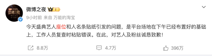 微博之夜官方账号随后发文:“今天盛典艺人座位和人名条贴纸引发的问题,是平台场地在下午已经布置好的基础上,工作人员复查时粘贴错误。在此,对艺人及粉丝诚恳致歉! ”截至今日6时50分,这条道歉微博的点赞数已经突破396万。