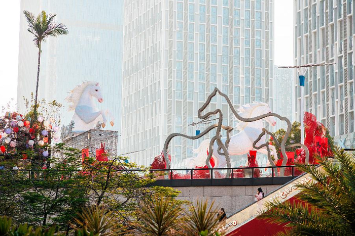 依托自身鲜明的马术特色,四海城今年重磅打造了以传奇“汗血宝马”为原型的大型新春美陈装置,造型栩栩如生,气势非凡。同时,马年元素全方位渗透于商圈之中:眼镜品牌MOSCOT的黄色骏马雕塑、Tombliboo炸鸡的黑色马形标识、精心设计的2026马年主题灯画,以及坐落于山顶公园、寓意生机勃勃的艺术钢马雕塑,共同彰显了四海城与马年文化的深度联结。