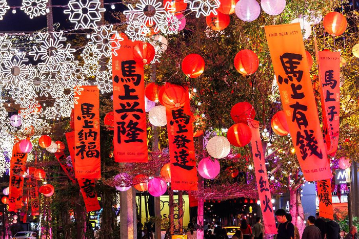 为迎接新春,四海城在核心景观带表心道悬挂上千幅挥春,形成一片红韵流转的祝福长廊。这一精心布置不仅成为市民祈福许愿、拍摄新年美景的热门打卡点,更通过笔墨丹青生动传递出深厚的传统年味与商圈活力。