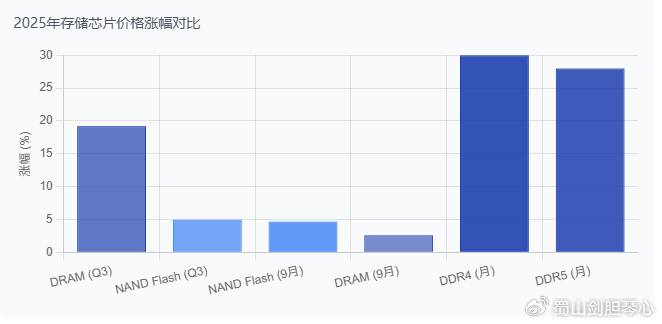 2025年以来,全球存储芯片市场呈现强劲的涨价态势。根据CFM闪存市场数据,2025年第三季度DRAM市场综合价格指数上涨19.2%,NAND Flash市场综合价格指数上涨5%。从月度数据看,9月单月NAND Flash上涨4.7%,已超过DRAM的2.6%月度涨幅,显示出涨价趋势的全面性。