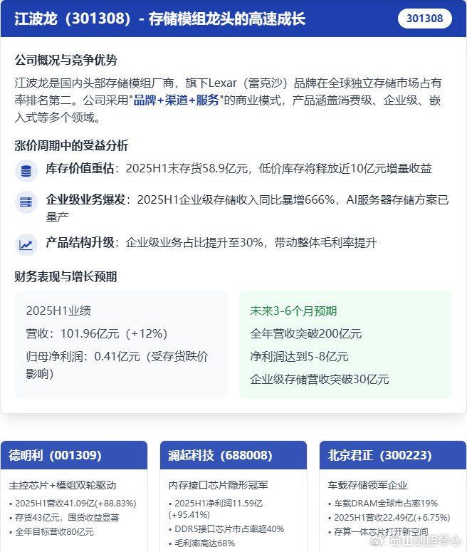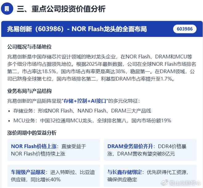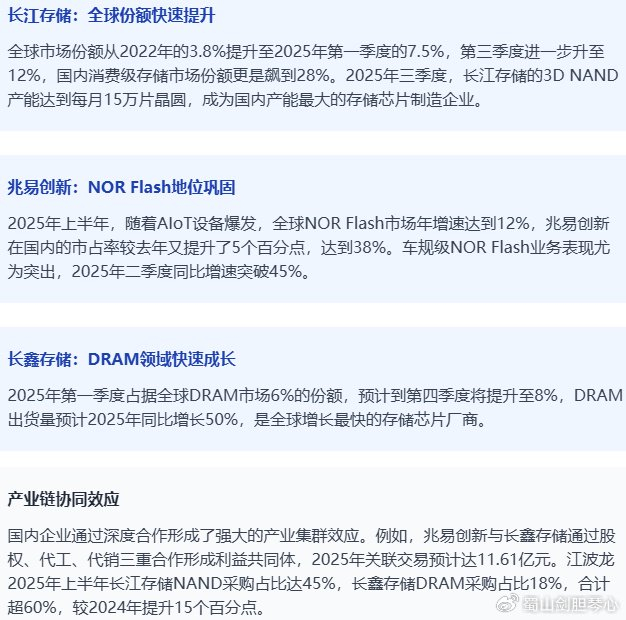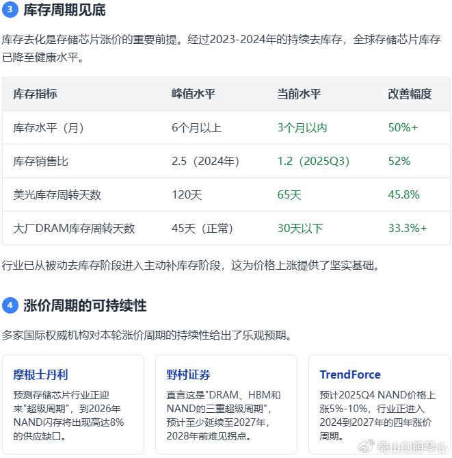 涨价可持续性核心逻辑:供给端扩产受限:新建晶圆厂需数百亿美元投资,投产周期长达2-3年,主要厂商新增产能要到2028年后才会释放需求端持续增长:AI数据中心建设加速,2025年全球AI数据中心建设速度加快,仅国内就有15个超算中心开工,对高规格存储芯片的需求同比增长200%技术迭代推动价值升级:HBM、3D NAND等新技术的应用提升了产品价值,使存储芯片从"纯周期品"向"周期+成长"属性切换