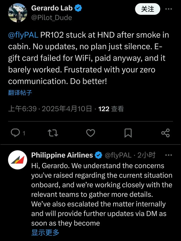 一位乘客下飞机后发文表示,“PR102客舱冒烟后卡在羽田机场了。没有进一步通知,没有计划,只有一片寂静。无法连接 WiFi,尽管我付了钱,但几乎用不了。你们零沟通,让我很失望。”菲航跟帖表示道歉,称正在加紧处理这一事件。